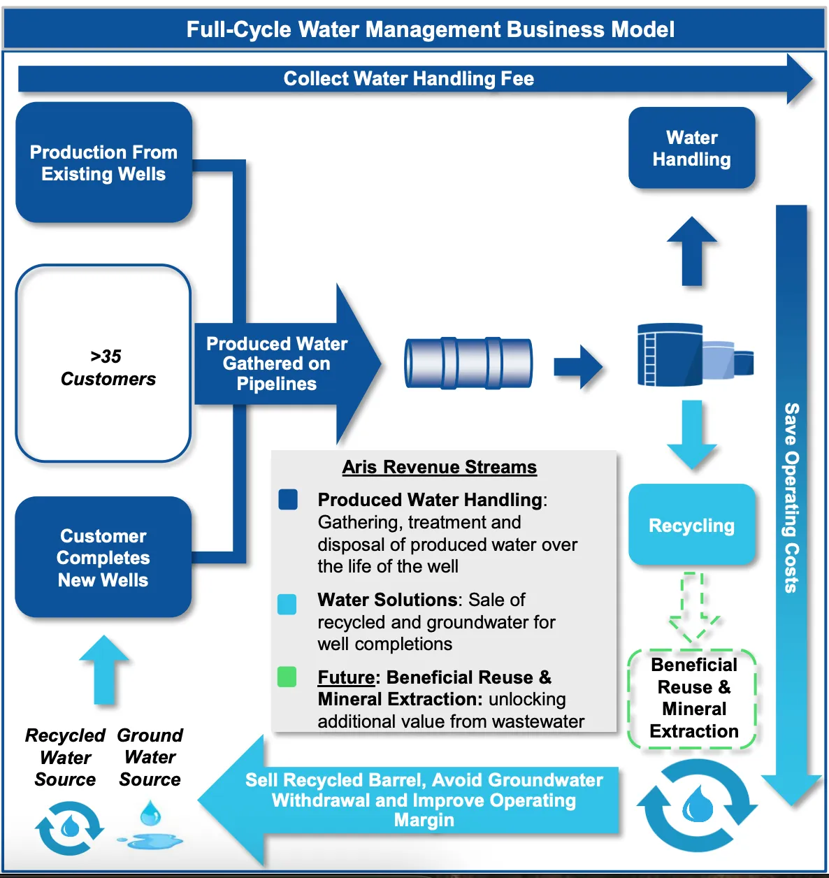 Additionally, water companies also sell the recycled water which in some cases can make up to 30% of their share of revenues (vs. 70% produced water). Below is a good representation on how the business model works (from Aris Water Solutions):